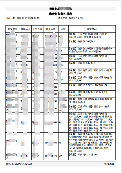 食堂工作人员通过平台打印统计患者点餐信息,打印直观报表,根据报表进行送餐工作,无需一个个去核对订餐信息及病床号。