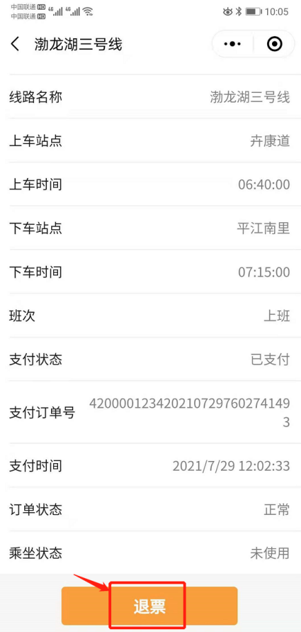 对于需要退票的订单,在“我的车票”订单详情中,点击底部的退票按钮可进行退票,退票后在“微信支付”中可看到退款详情。
